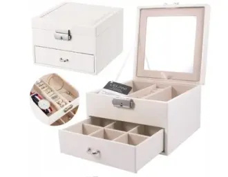Дуже функціональна та елегантна скринька для прикрас та годинників. Особливості продукту: - Виготовляється із стьобаної еко-шкіри найвищої якості, внутрішнє оздоблення – Велюр - Велика, дуже функціональна і продумана до дрібниць - Замикається на металевий замок з ключем - Скринька має 2 рівні з відділення для зберігання: кілець, сережок, намист та багато іншого. Верхній знімний рівень, крім того, в ній є окрема знімна коробка для найдорожчих цінностей, яку зручно взяти з собою. - Висувне дзеркало - за його допомогою ви легко зможете зробити макіяж та одягнути улюблені прикраси - Скринька ідеально підходить для подарунка!