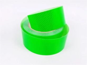 Стрічка світловідбиваюча сіра (в активній фазі, при відображенні світла холодно-біла) на тканинній основі флуоресцентного салатового кольору, шириною 50 мм для шиття одягу, спецодягу.
