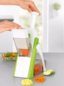 Мультислайсер Safe slice mandoline є багатофункціональним напівавтоматичним пристроєм з вбудованою системою лез з нержавіючої сталі для нарізки найрізноманітніших овочів і фруктів.