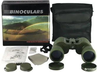 Бінокль Bassell 20x50 укомплектований: м'яким чохлом-сумкою з чорної непромокальної тканини з ремінцем, ремінцем для шийного носіння, гумовими кришками для захисту окулярів та об'єктивів, хусткою для догляду за оптикою та інструкцією.