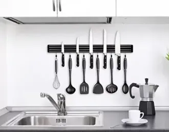 Настінний магнітний тримач для ножів – це чудове пристосування для кухні! Ваші ножі завжди будуть під руками, вони не займатимуть місце в ящику столу, а утримуватимуться на стіні за допомогою магнітної рейки. Ви зможете використовувати цей тримач не тільки для кухні, але і для сараю, комори або гаража. Всі металеві інструменти легко прилипнуть до магнітного утримувача і при цьому завжди будуть на увазі і в повному порядку. Магнітний тримач легко миється та чиститься, на ньому не будуть накопичуватися бактерії, як на звичайних підставках.