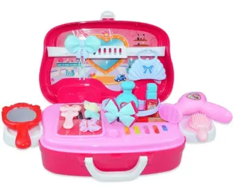Дитячий ігровий набір Салон краси — кожна маленька дівчинка мріє про своє затишне містечко, де вона могла б грати, виглядати в дзеркало і наводити красу. Іграшка є справжнім салоном краси, столиком з дзеркалом і набором аксесуарів. Трюмо компактно збирається у валізку сумочку. Малятко зможе носити з собою свій маленький салон краси.