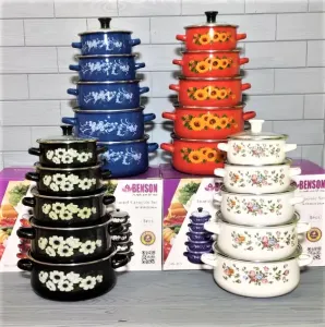 - Набір складається з п'яти каструль виготовлених з нержавіючої сталі товщиною 2 мм, які покриті трьома шарами емальованого покриття.