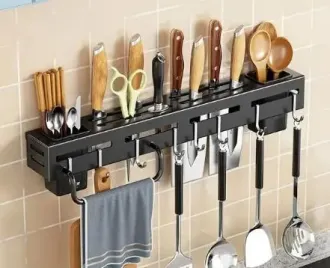1 кухонна полиця для ножів (30 x 5,5 x 7,4 см) + 1 вішалка для рушників + 1 тримач ложки + 8 гачків + 2 гачки + гвинти. Чорний колір. Матеріал: нержавіюча сталь.