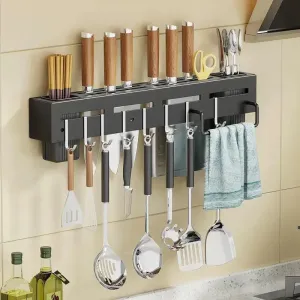 Настінний органайзер для кухні допоможе грамотно розподілити інструменти та кухонне приладдя, що особливо важливо в невеликих приміщеннях. Тепер все необхідне завжди буде у Вас під рукою! Легкий та міцний. У комплекті 8 гачків які можна пересунути по полозах на власний розсуд. Дві склянки для столових приладів з перфорацією, а також прорізи тримачі для ножів різного розміру. Полиця поперечина для рушників. Два варіанти кріплення: