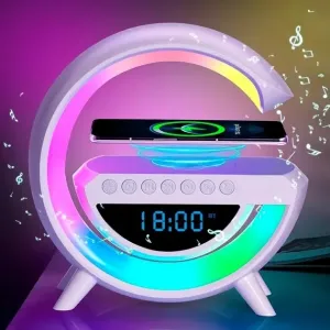 Ви також можете налаштувати лампу, завантаживши власні аудіокліпи та пісні у програму. Лампа має унікальні функції, які рідко зустрічаються у звичайних настільних лампах чи будильниках. Форма у вигляді логотипу Google відразу привертає увагу, а включивши її здивують кольори, якими вона може підсвічуватись. Допомагає заснути. Як би там не було, ви можете підключати лампу через Bluetooth до свого телефону і включати «білий шум», який добре впливатиме на вашу здатність заснути та якість сну. Природний будильник. Щоб вам легше було прокинутися, виробники розробили систему природного пробудження, що нагадує схід сонця. Лампа починає вмикати світло рівномірно від 0% до 100% яскравості (все це займає 3 хвилини). Різнокольорове підсвічування. У лампі є 256 режимів нічного освітлення! Це дуже багато, але можливо. Налаштування світла відбувається через програму HappyLighting. З його допомогою ви зможете підібрати колір освітлення, який буде найбільше вам до душі. Не лише лампа, а й музична колонка. У G-Smart Light Sound Machine є вбудовані динаміки, що виводять об'ємний звук на 360 градусів. Підключення здійснюється між пристроями через Bluetooth. Увімкнувши музику на телефоні, вона відтворюватиметься лампою. Світло може змінюватися в ритмі музики – високі яскраві та прозорі частоти, середні частоти чіткі та динамічні, бас глибокий із почуттям гучності. Безпровідна зарядка. У лампі вбудована бездротова зарядка з напругою 15Вт. Завдяки дизайну лампи розміщувати телефон дуже комфортно. Швидке заряджання дозволяє короткий проміжок часу відновлювати заряд акумулятора на телефоні. Для безпеки встановлений захист від перевантаження струму, перенапруги, перегріву та виявлення сторонніх предметів, щоб не пошкоджувати телефон та його акумулятор.