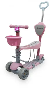 як беговел, знімається батьківська ручка зі спинкою і дитина їздить на самокаті, сидячи на сидінні і відштовхується ногами, як на біговелі.