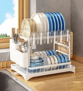 Решітка для сушіння посуду для кухонної стійки: щоб заощадити простір вашої маленької кухонної стійки, ця сушарка для посуду має двошарову конструкцію великої місткості та дозволяє зберігати майже весь посуд. Виконана з вуглецевої сталі, модель має фарбоване покриття, виглядає стильно та сучасно. Передбачено дренажну панель для збору будь-якої доступної води. Це по справжньому великий органайзер для зберігання столового посуду, який заощадить місце на вашій стільниці!