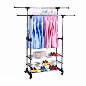 Підлогова, подвійна телескопічна вішалка-стійка для одягу, 3 полиці для взуття 130 х 45 х 160 см